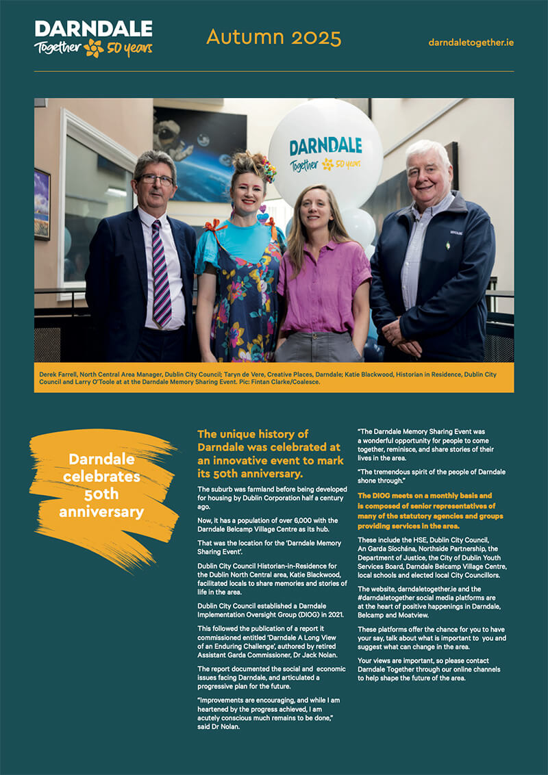 The history of Darndale was celebrated at an innovative event to mark its 50th anniversary. Darndale, north of Coolock, was farmland before being developed for housing by Dublin Corporation half a century ago. Now, it has a population of over